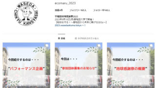 お知らせ 早稲田地球感謝祭2023のインスタを立ち上げました! Instagramでは参加団体・企画の紹介、当日の見どころなど地球感謝祭をより楽しめるような情報を定期的に発信していきます! ぜひ、ご確認ください。 Instagramアカウント名 @ecomaru_2023 2023.06.02 お知らせ